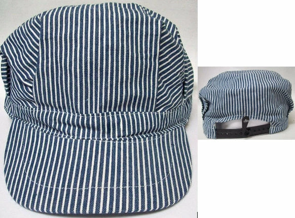 All Aboard! The classic train engineer hat is a 100% cotton pinstripe denim. The style is popular amongst train enthusiasts, no matter their age! This cap features pleats all around the sides to the back to create its unique squared-off crown. The preformed bill measures 2.75″ and features an adjustable plastic tab back to fit all size adults. Also available in childrens sizes.