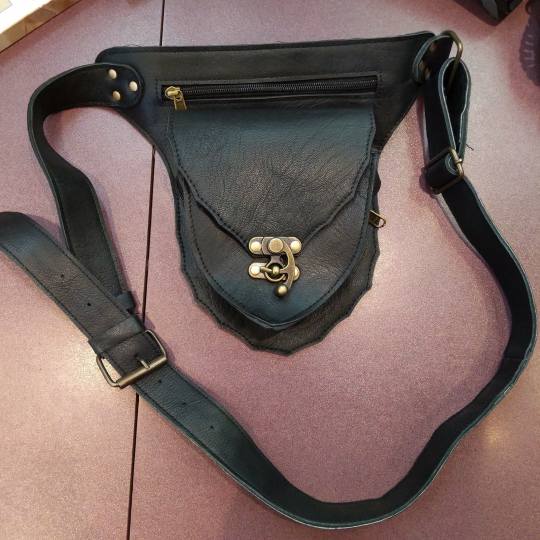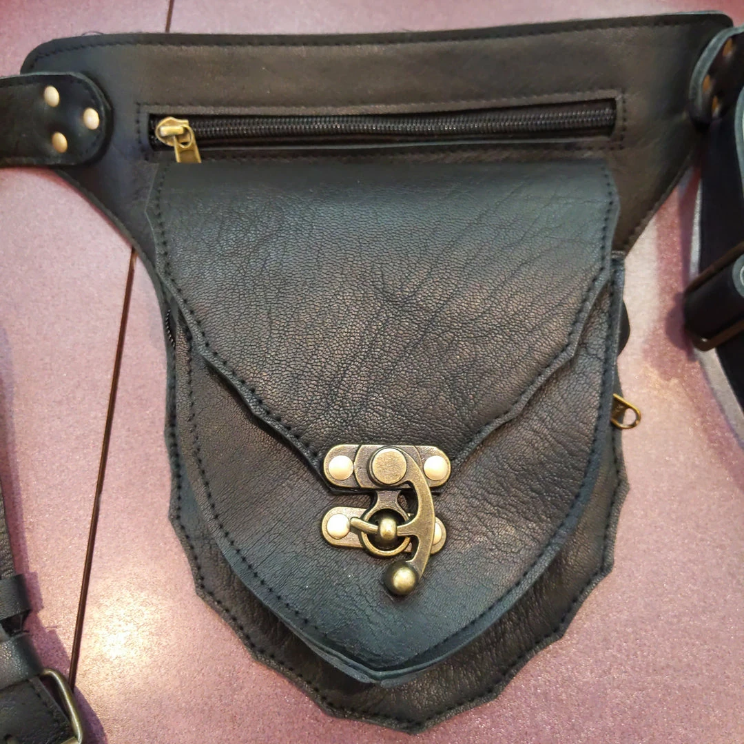 This leather pocket belt has three zippered pockets and one large clasp pocket for all your treasures! It has a long belt that is adjustable to a wide range of sizes. Add this to complete your look for Pirates, Ren Faire, Steampunk and Viking costumes! Available in brown and black, with gold closures.