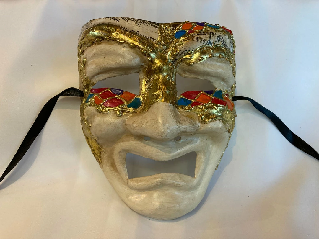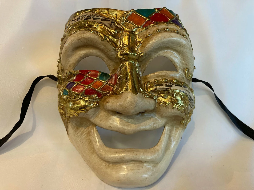The masculine paper mache’ Comedy or Tragedy Face Mask is a classical theme for Venetian plays.  The theatrically style mask features musical notes and bright colorful stained glass looking accents.  Slight imperfections may be present as normal with paper mache’ products. Perfect for Masquerade parties or as a decoration.