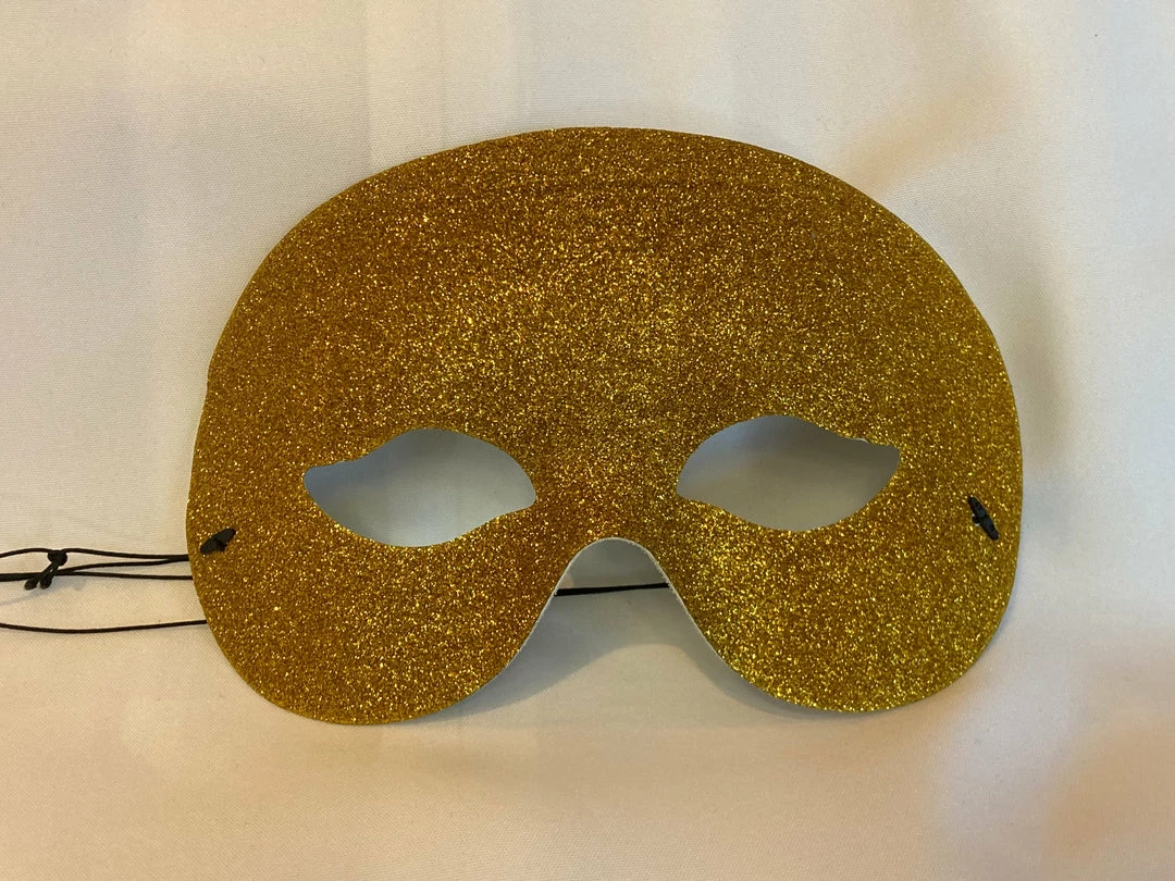Gold Glitter Fabric Half Mask has an elastic strap to fit over the face.