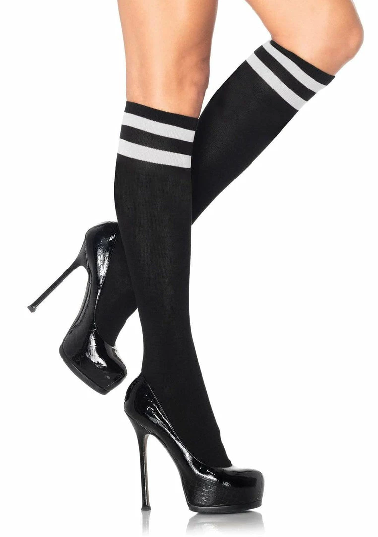 Lightweight Opaque black knee high socks have two white stripes at the top. The fabric content is 71% Acrylic, 25% Nylon, and 2% Spandex. These are perfect for any type of athletic inspired costumes or for everyday wear.