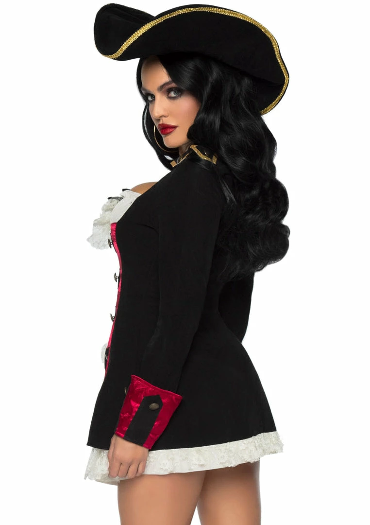 The pirate hooligans will swab the deck in this adorable Charming Pirate Captain Dress. Features black velvet (non-stretch) layered waistcoat dress with ivory lace and red lapel and gold button details. This costume runs small and has a zippered back. Pirate hat and boots available separately.