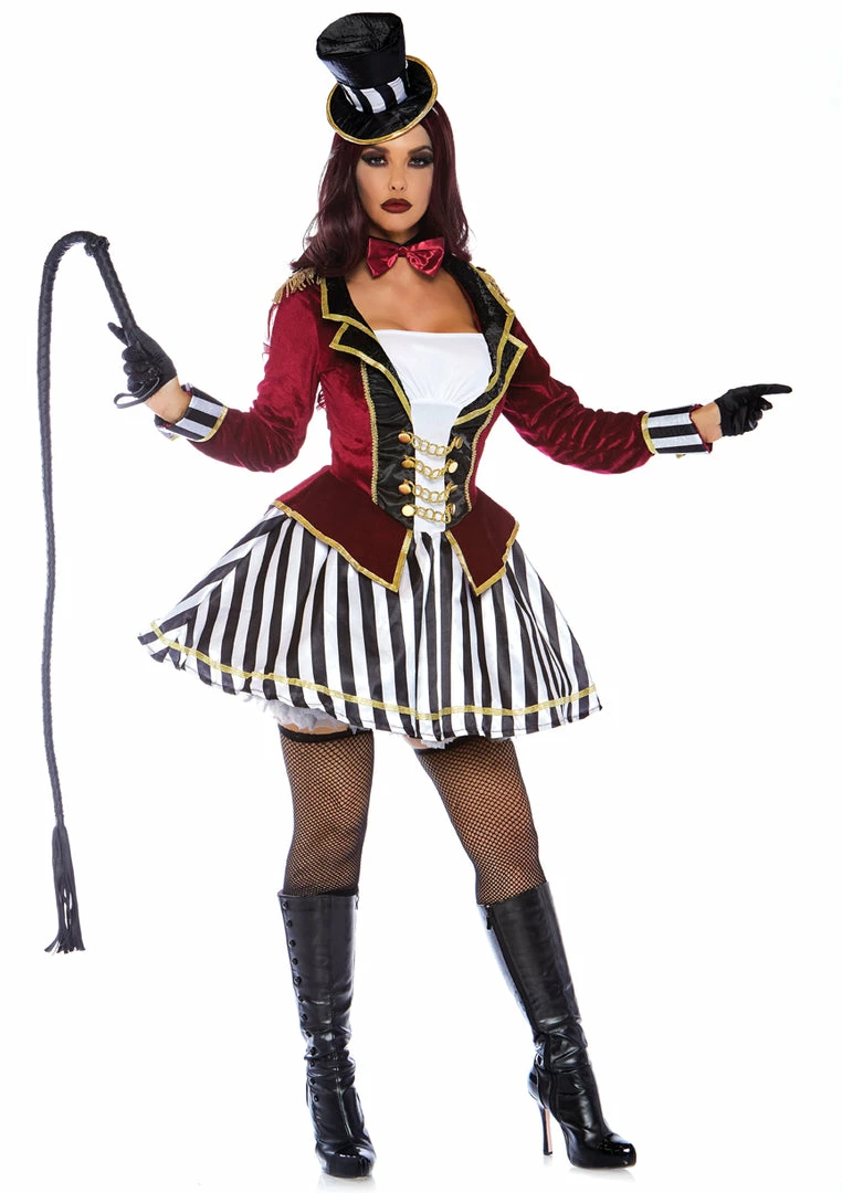 Be the master of your own three ring circus with this adorable Ringmaster Girl costume! The burgundy velvet tuxedo dress has black sequin lapels with a zippered back closure and a black and white striped satin skirt. Also includes a burgundy bowtie and mini black tophat with black and white striped band. Thigh high stockings and whip are available separately.