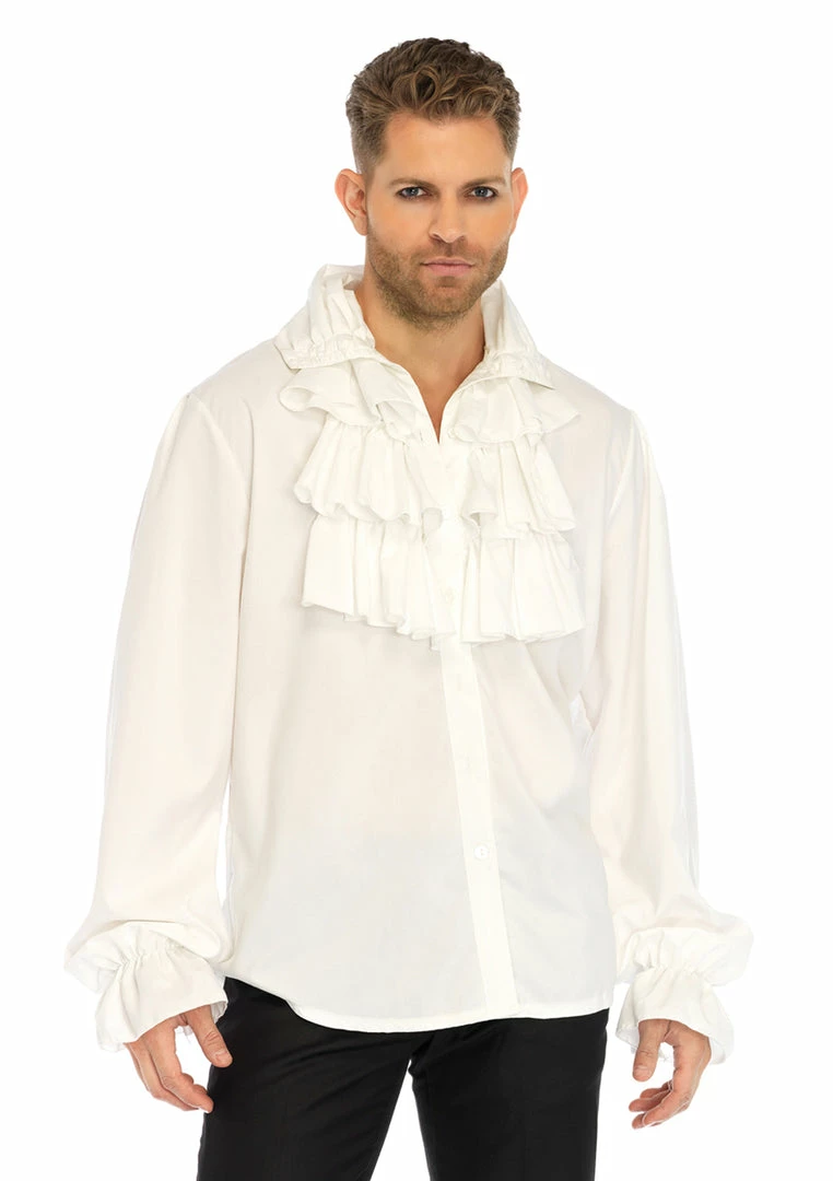 Our White Ruffled Front shirt is a best seller and works well for pirates, colonial, aristocrats, Dracula, steampunk, rock stars and even as the “Puffy Shirt”. The buttons go up to the neck so you can achieve the high neck ruffled look of so many vintage clothing styles. Wear on its own or with one of our elegant velvet coats to create an handsome look.