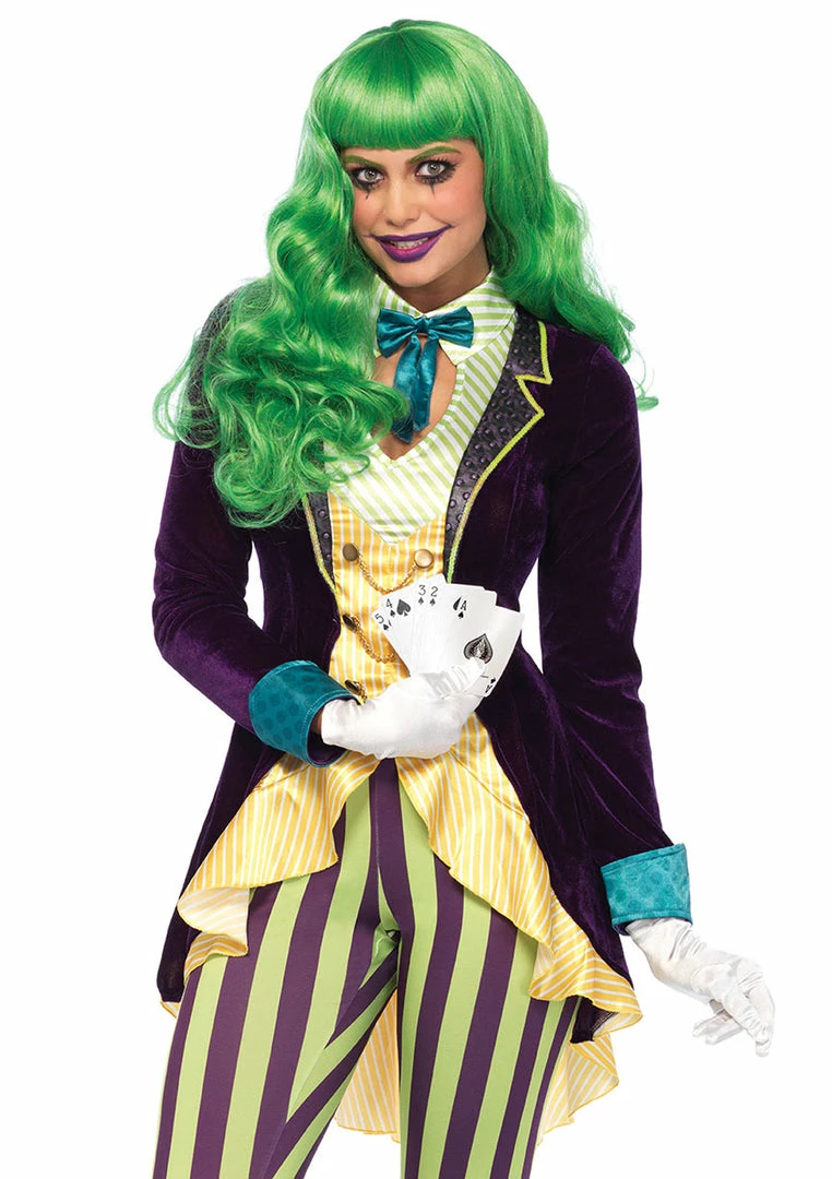 Be careful who you joke with in this Wicked Trickster Costume. Includes purple sequin trimmed velvet and satin high low jacket with attached bowtie and matching striped purple and green leggings. Wig and gloves available separately.