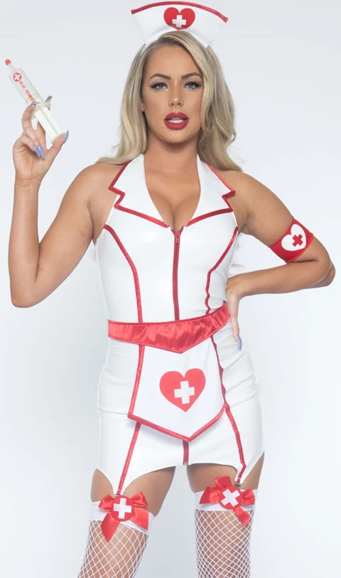 You will be the hottest nurse in the ER! The vinyl ER Hottie Nurse costume features a front zipper wet look vinyl garter dress in white, a heart apron, arm band and a headpiece.