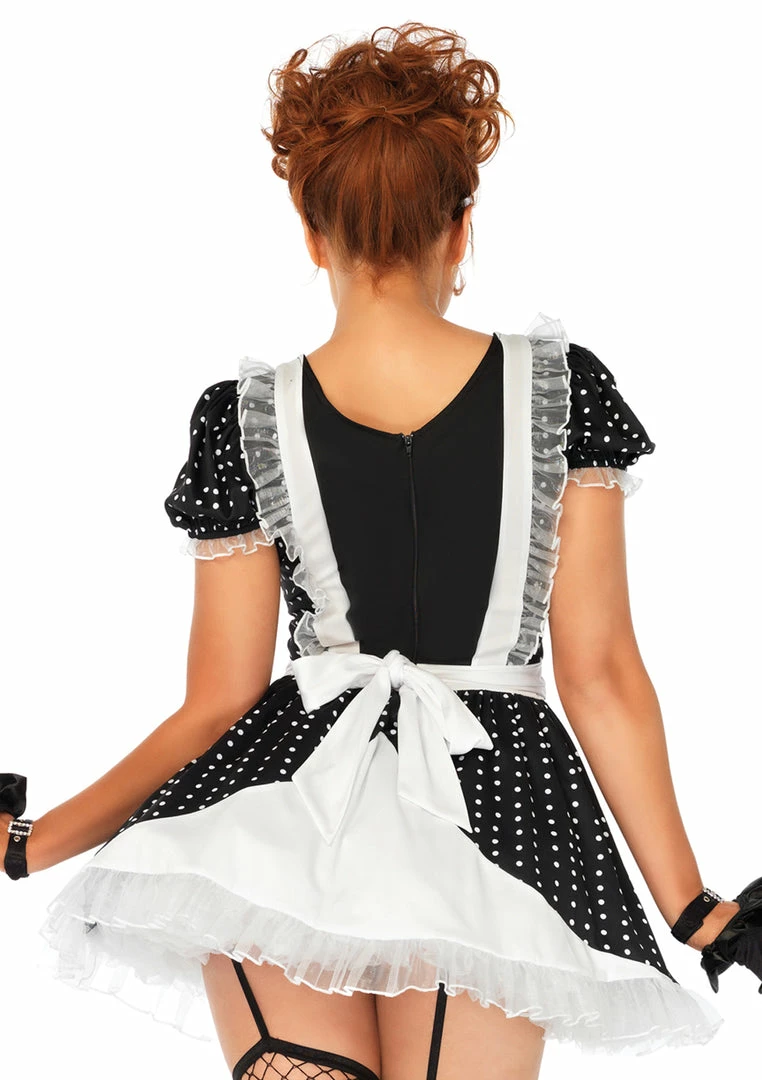 The darling polka dot French maid dress gives off a playful retro vibe and the attached apron ties back on the fun frilly skirt. Paired with the matching hat, your sexy uniform is sure to inspire cleanliness. Other French maid accessories available separately.