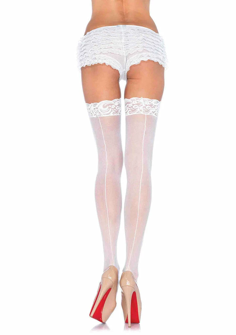 Sheer Lace Top Thigh High Stockings with Backseam have an elasticized leg top designed to stay up on the thigh. For thinner legs, double stick tape, Stik-it glue, or a garter belt (not included) is recommended. Available in two sizes: One Size fits up to 160 pounds and Plus Size fits up to 220 pounds.