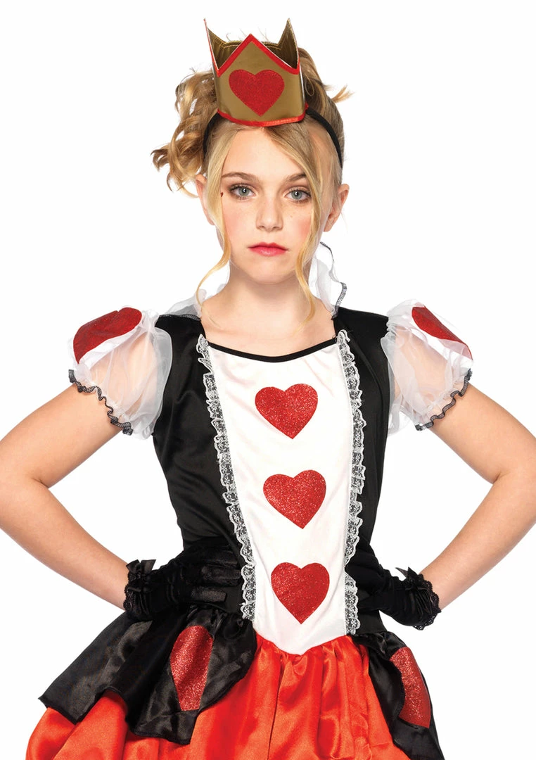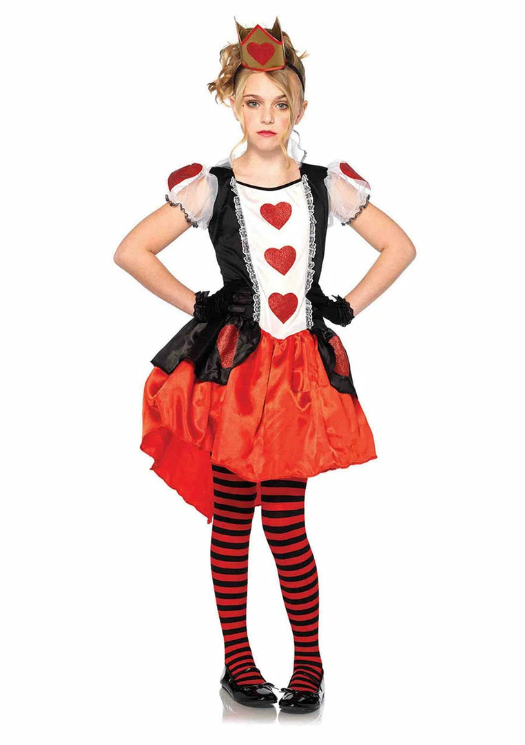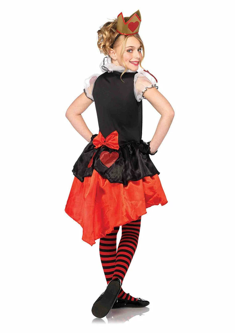 The Queen of Hearts looks regal but is really evil. The puff sleeve dress with hearts and hi-lo skirt will show off a great pair printed tights. Tights and wand available separately.