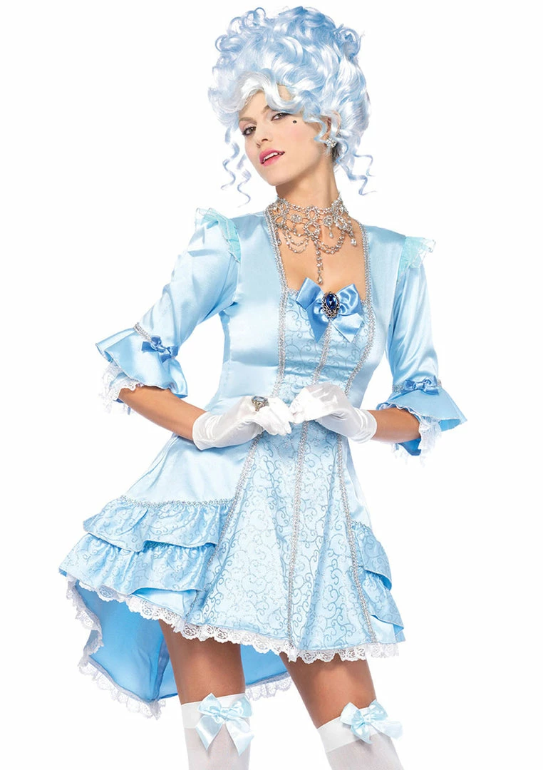Deluxe Versailles Beauty, includes glitter scroll high/low zipper back dress with layered ruffle hem, ruffle shoulder accents, jewel satin bow accent, and pin-on back bow. Wig, hosiery and accessories available separately.