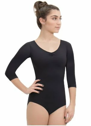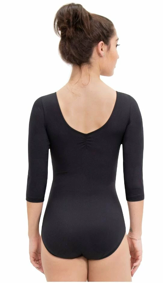 Subtle pinch front and back leotard has a 3/4 sleeve and moderate leg height.