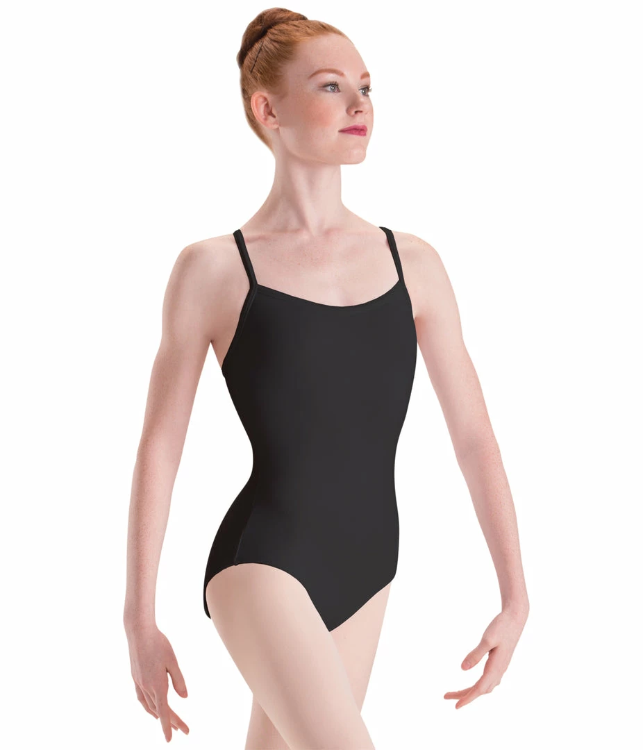 A beautiful basic for class, this leotard features camisole straps that meet in a V in the back and a scoop front. Leotard has a ballet cut leg line and a full front lining.