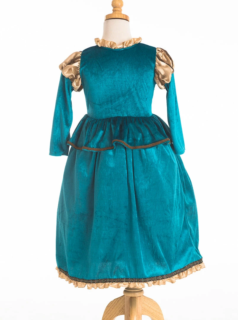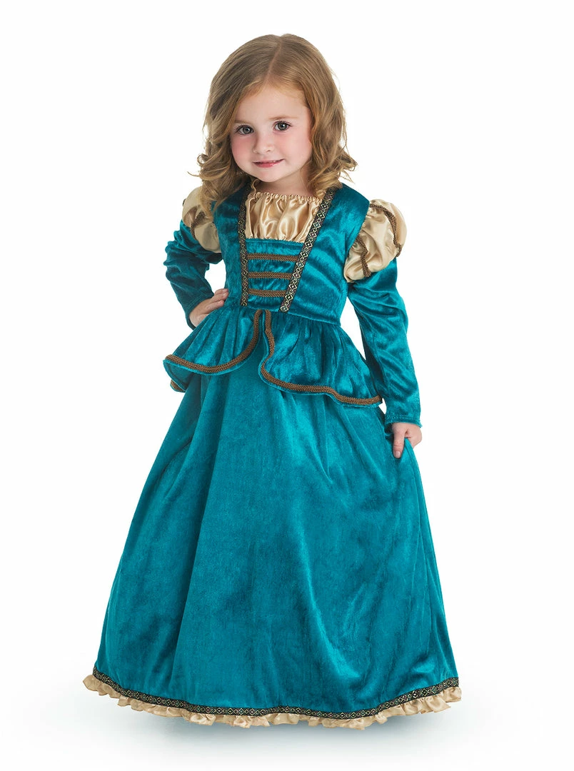 Our elegant Medieval Princess dress will give your little one the courage to take on every foe and face any new adventure. The bodice is made from lavish dark teal crushed velvet, with intricate gold edging and silk puff sleeves. The full velvet skirt is edged with gold satin and adorned with gold edged hip drapes, and will have your little one dancing through the Scottish heather.