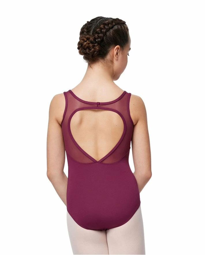 This gorgeous tank leotard has a high scoop neck with full frontal tactel lining and a bit of mesh along the strap. The mesh creates a teardrop opening in the back, with microfiber in the torso.