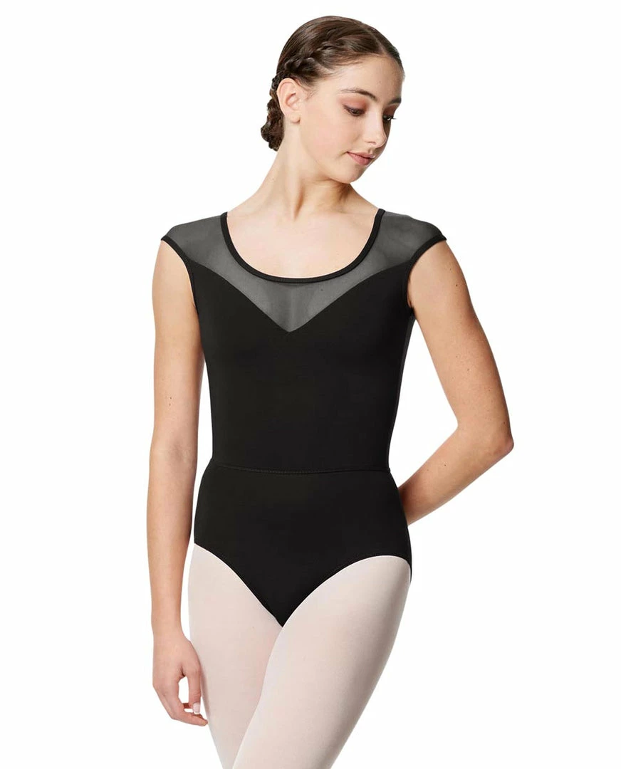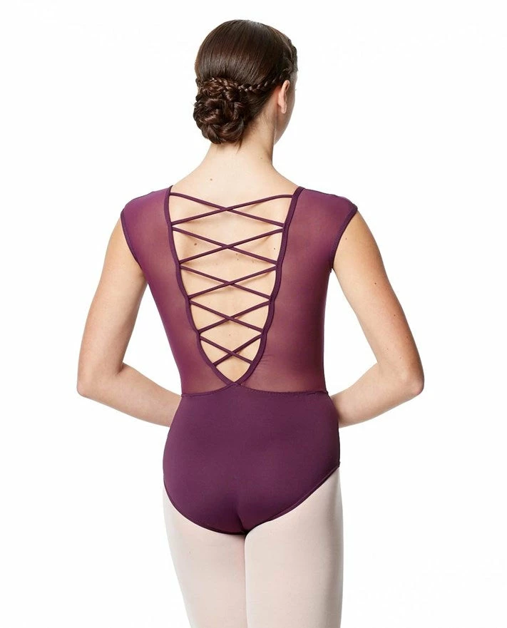 This gorgeous leotard has a mesh scoop neck and cap sleeves with a flattering strappy criss-cross back, while the microfiber creates a sweetheart neckline.