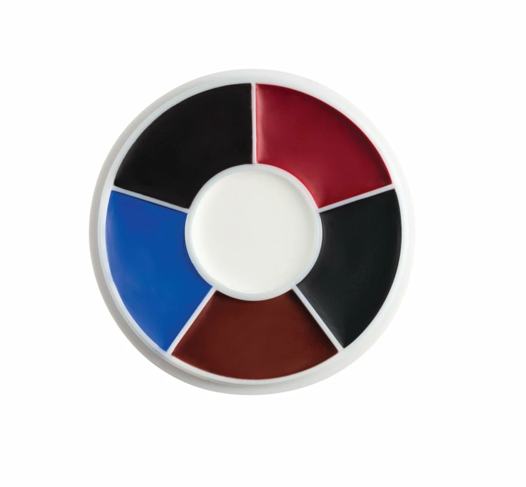 Pro Creme Wheels provide professionals with unlimited character options. All can be layered for intensity and thinned with alcohol to create a translucent wash. This wheel includes dark crimson, fresh cut, black&blue, blood red, blue, and white. Blood shades are great to simulate various subtle injuries (fresh or healing). Set with Neutral Set Colorless Powder.