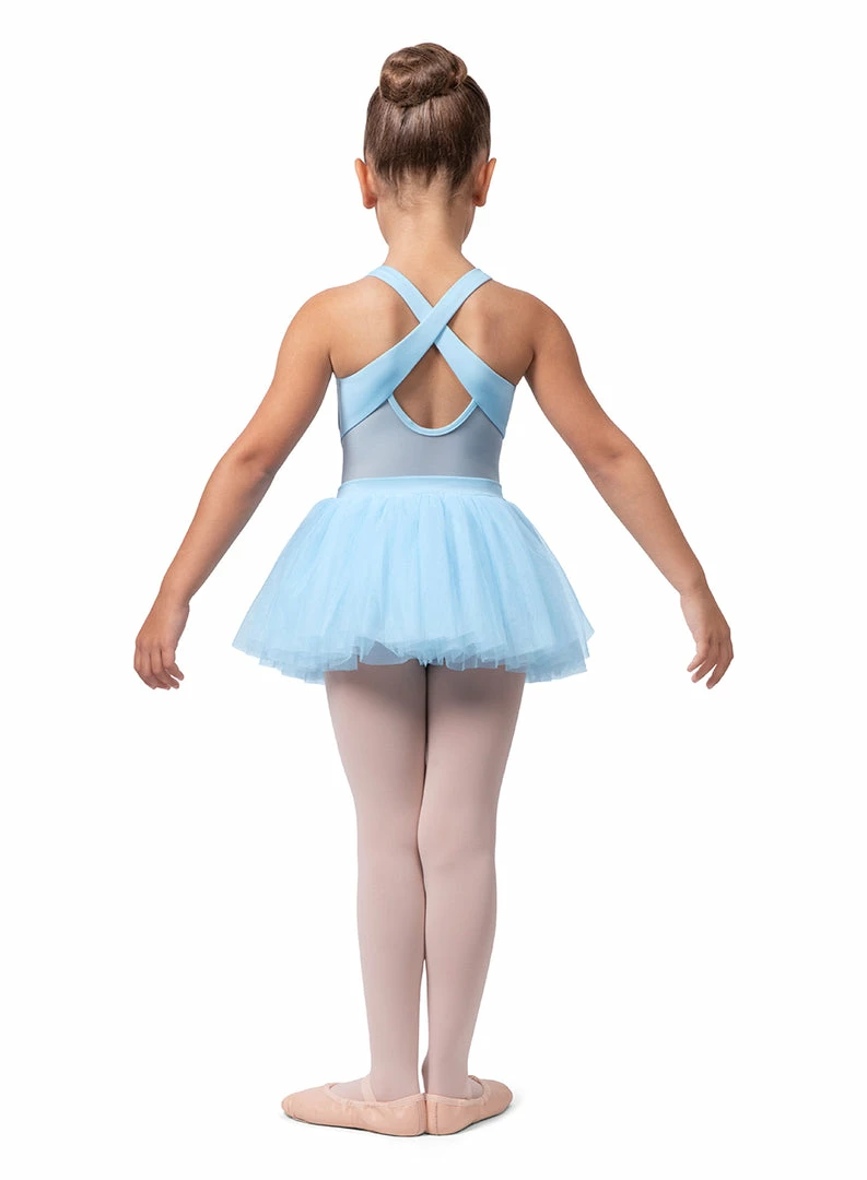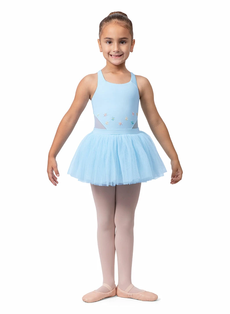 Little dancers will love leaping and pointing in this enchanting leotard, fit with traditional tutu skirt crafted from graduated layers of tulle. The bodice is embellished with delicate star embroidery and mesh insets at the waistline. The tank straps continue across the shoulders into a criss cross back, a small cut out and mesh feature at the waist.