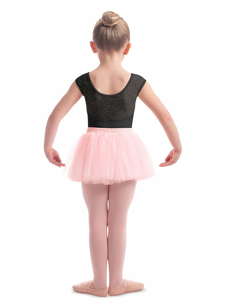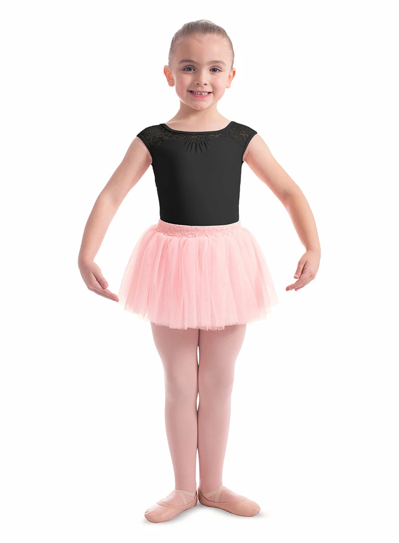 The simple yet sophisticated lace cap sleeve leotard in black is perfect for class. The high neckline has an delicate accent of lace sleeves. A scoop back with fabric binding finish this precious look. Skirt is not included.