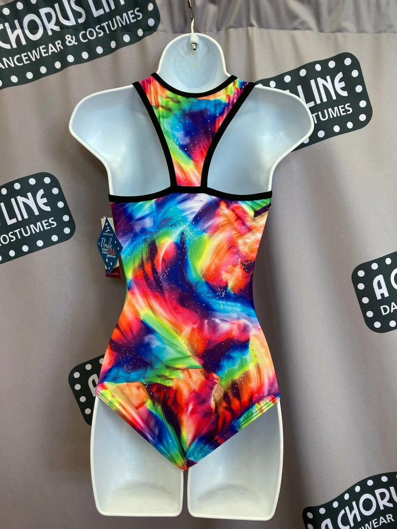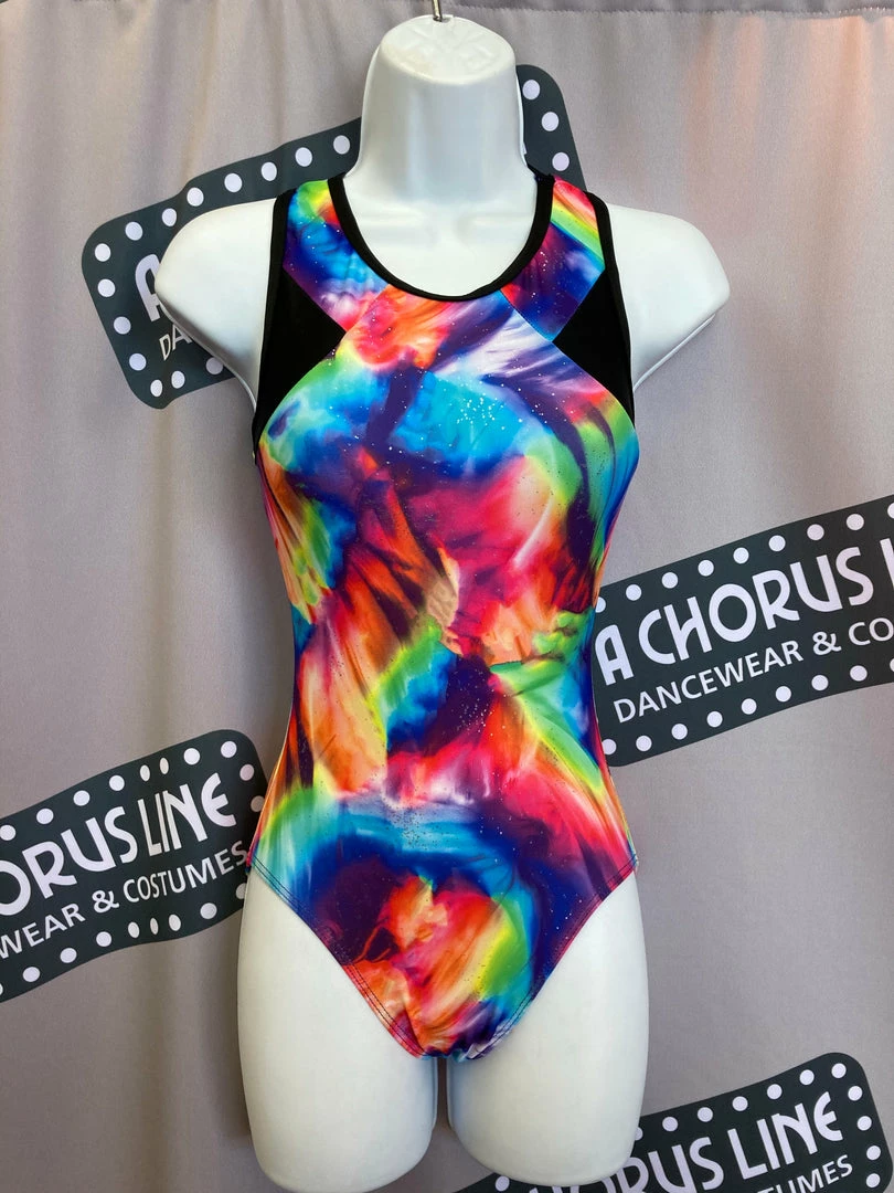 The classic high neck Gymnastics Brush Strokes (252) colorful print leotard has a racer back. The black accents and binding add some dimension to this flattering style. The rainbow brush stroke print by Motionwear has subtle silver glitter flecks added into the fabric. Fabrication is 86% Polyester and 14% Spandex. Made in the USA.