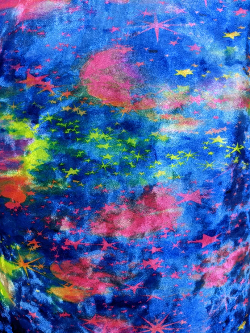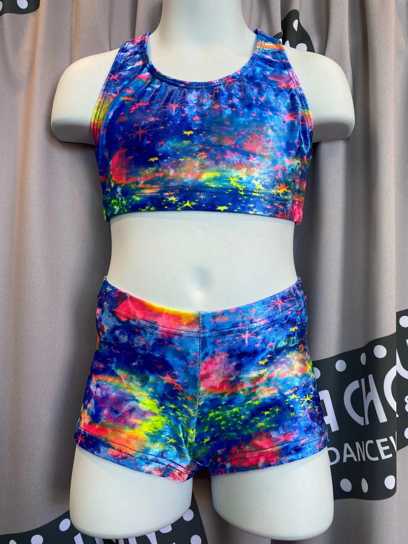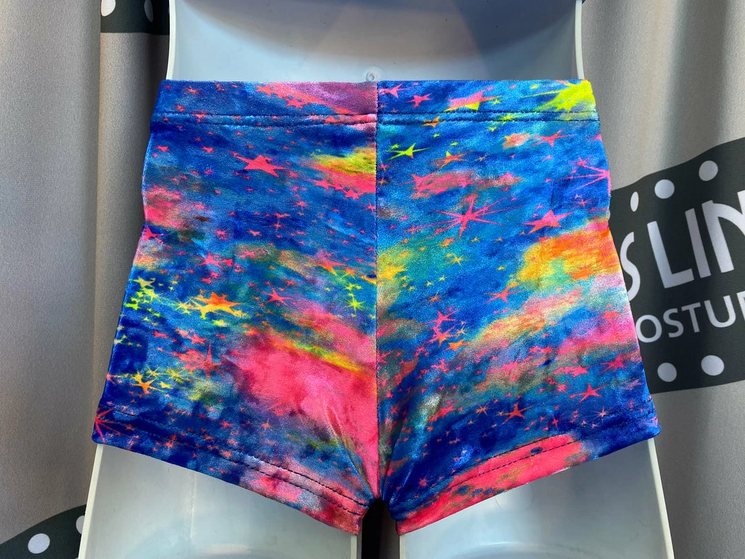 Soft and comfortable velour fitted shorts in the Cloud print offers hints of blue, pink and yellow.  The printed shorts are great for gymnastics or dance.  Wear with a gym leotard, matching crop top or cut Dance T-shirt for a cute and comfortable look.  Fabric is 91% Tactel nylon and 9% Spandex.
