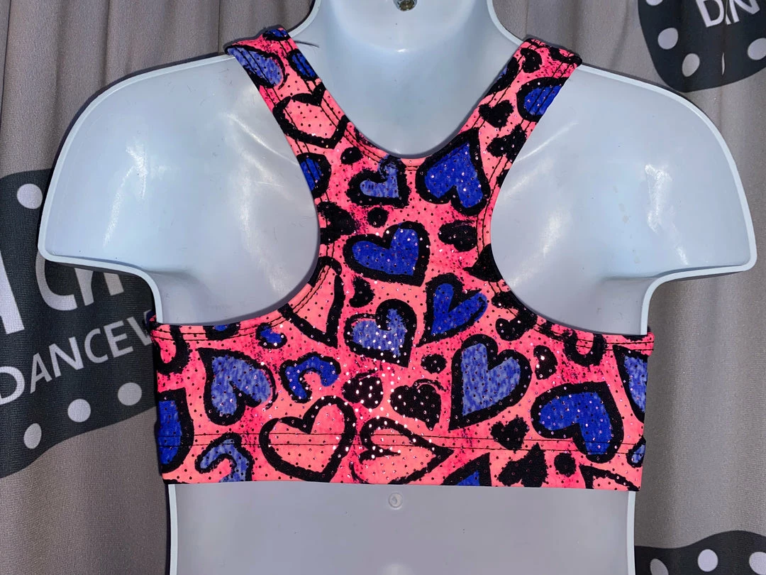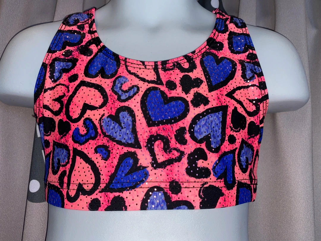 Lycra tank sports bra in the Wild Hearts print has a hot pink base with blue and pink hearts and metallic accents. The printed top is great for gymnastics or dance. Wear with contrasting or matching gym shorts or leggings for an easy to move in attire. Fabric is 90% Polyester and 10% Spandex. Made in the USA.