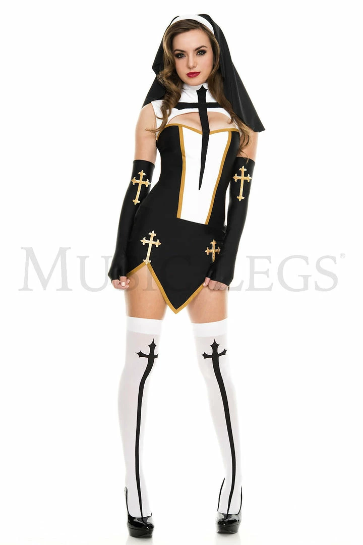 Confess all your secrets in this Bad Habit Nun costume featuring a black dress with a high white neck, a cut-out bust, a black cross accent, a white front panel with a gold trim, a tulip skirt with a gold trim, gold cross appliques, a black and white habit, black fingerless gloves with gold cross detailing, and white thigh high stockings with black cross detailing. Pair with the Deluxe Priest Costume for a great couples costume!