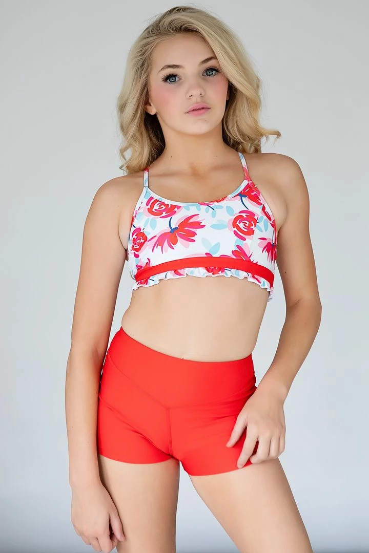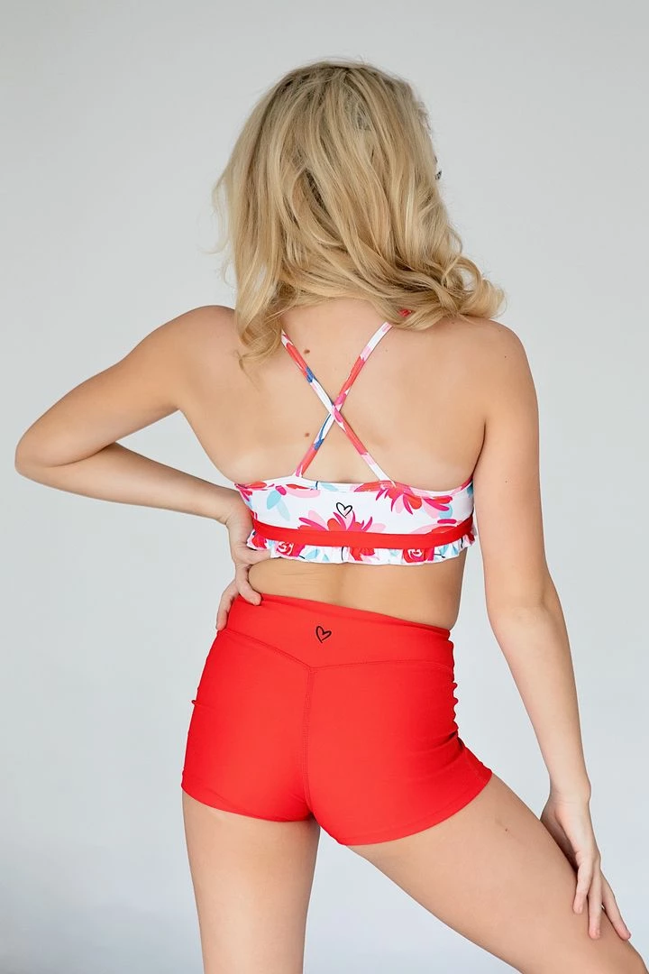 The fabulous new Love and Liberty collection by Oh La La Dancewear created the limited edition Forever Crop Top in a festive and bold print. The bright and bold floral print has a white base with scarlet, light blue and pink accents. The top has camisole criss cross back straps with a trendy yet romantic sporty ruffle and a band of scarlet trim along the bottom. The crop top is a very deluxe quality weight fabric (73% Polyester 27% Spandex) and is fully lined. Get yours before they are gone!