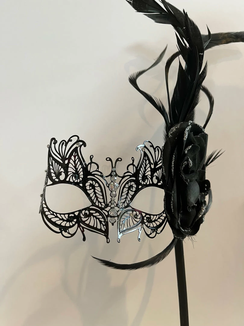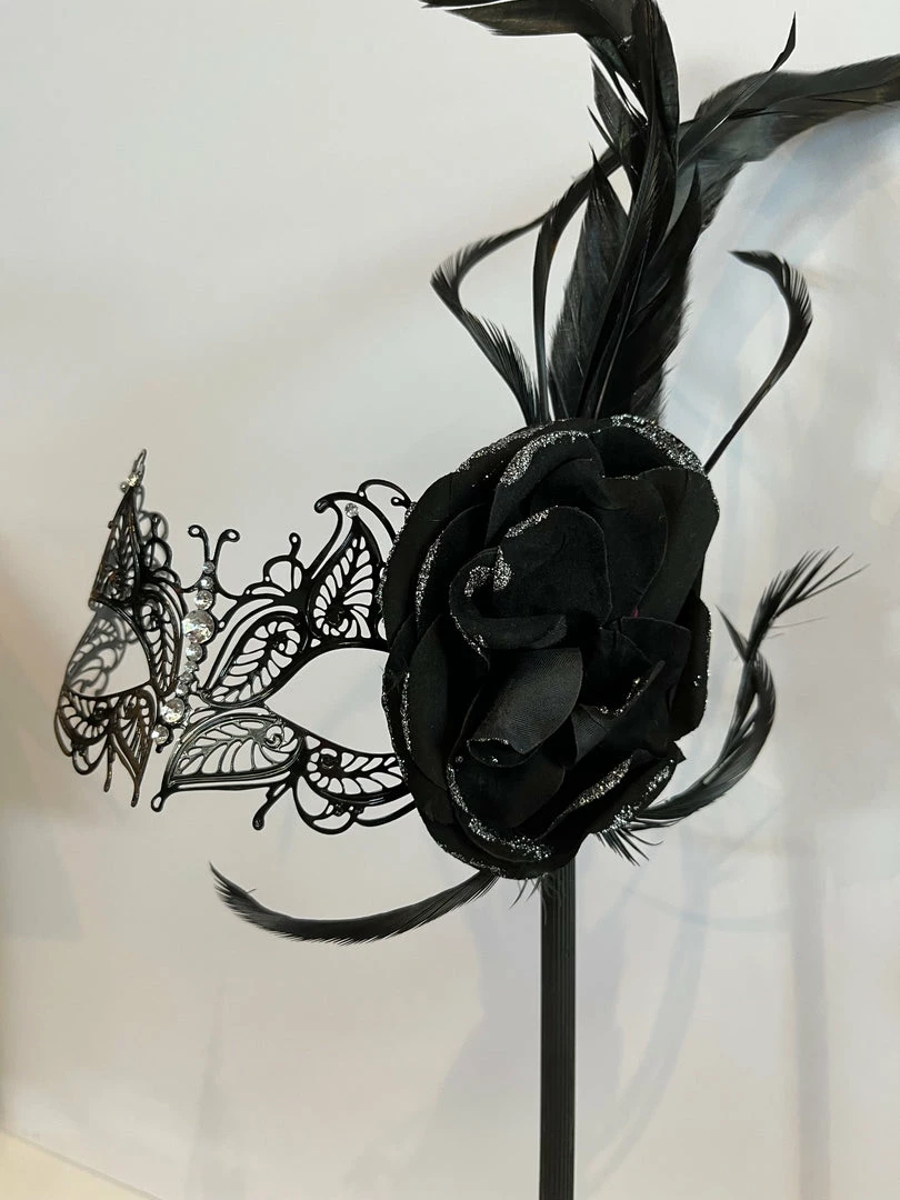 The Roselle mask is intricately detailed with shining rhinestones on the bridge of your nose and along the edges. There is a large black rose with glittery edges on the right side of the mask that attaches a long black feather and convenient black handle. This laser cut flexible metal mask looks gorgeous with a variety of costumes, from masquerade to princess to Bridgerton!