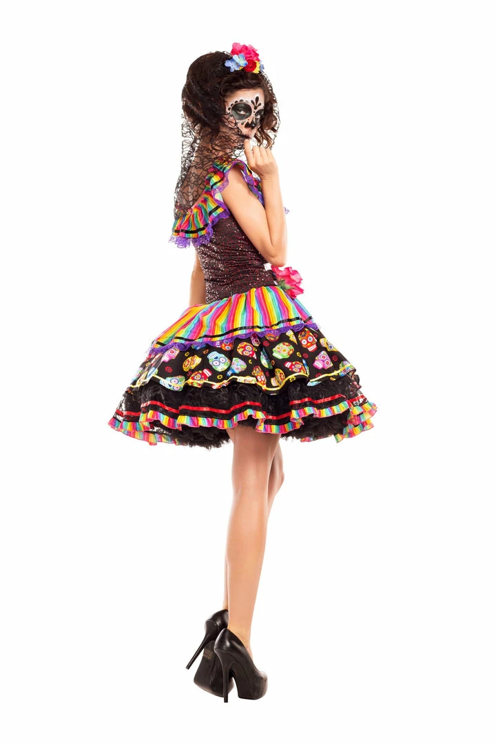 Get ready to be invited to all the special Dia De Los Muertos celebrations with this playful Sugar Skull Senorita Costume. The colorful dress features a sugar skull print, sequin detail and flower accents.