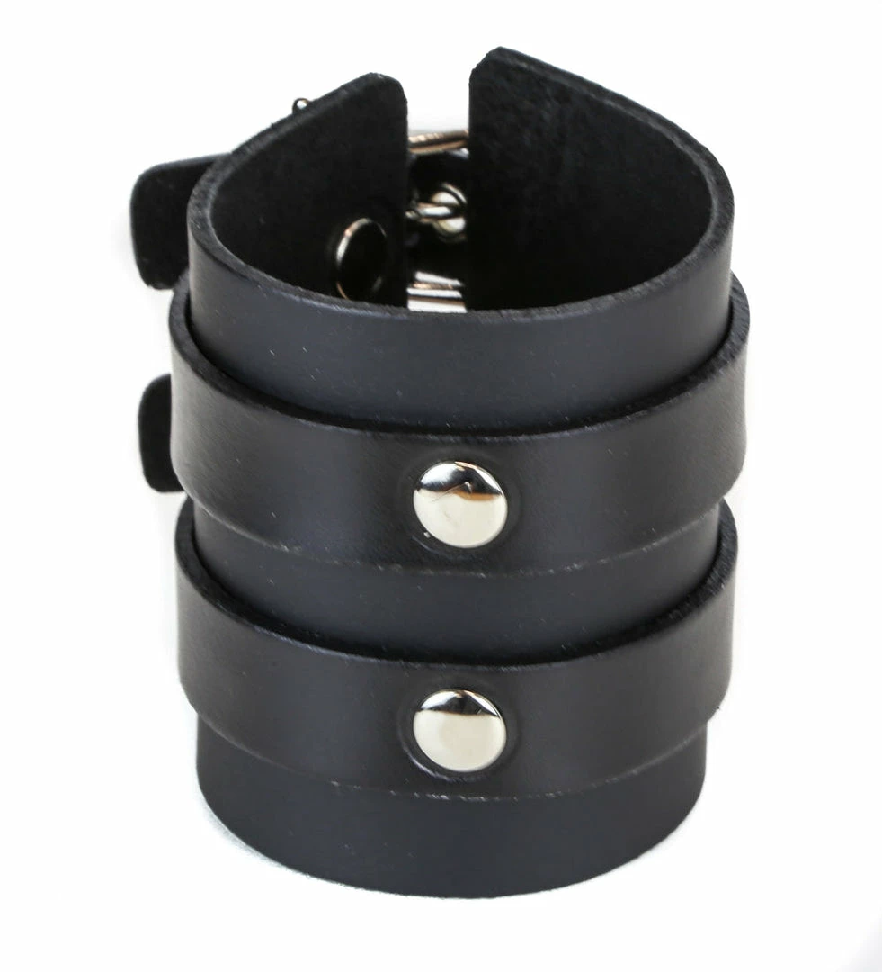 This black leather bracelet has 2 large adjustable buckles with flat studs in the back. Great for punk, rockers, gothic, 80’s, grunge and so many more!