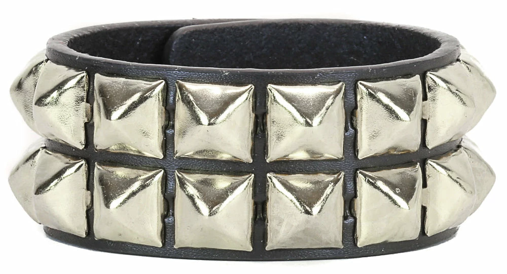 This black leather bracelet has 2 rows of silver 1/2″ pyramid studs with snaps to close. Great for punk, rockers, gothic, 80’s, grunge and so many more!