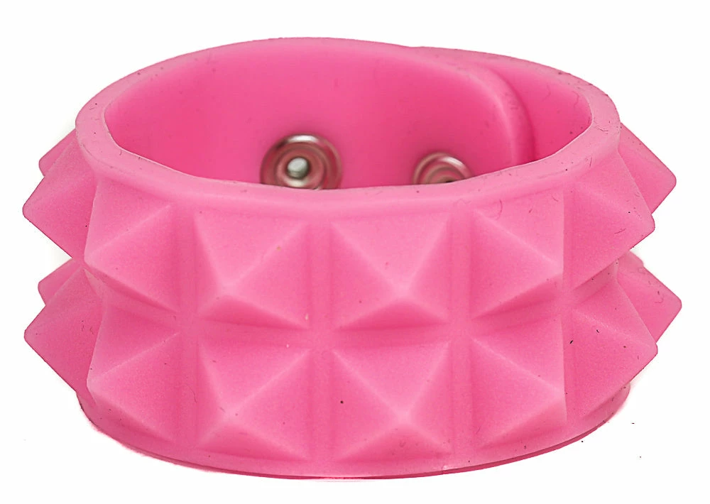 This bright pink rubber bracelet has 2 rows of 1/2″ pyramid bumps with snaps to close. Great for punk, rockers, gothic, 80’s, grunge and so many more!