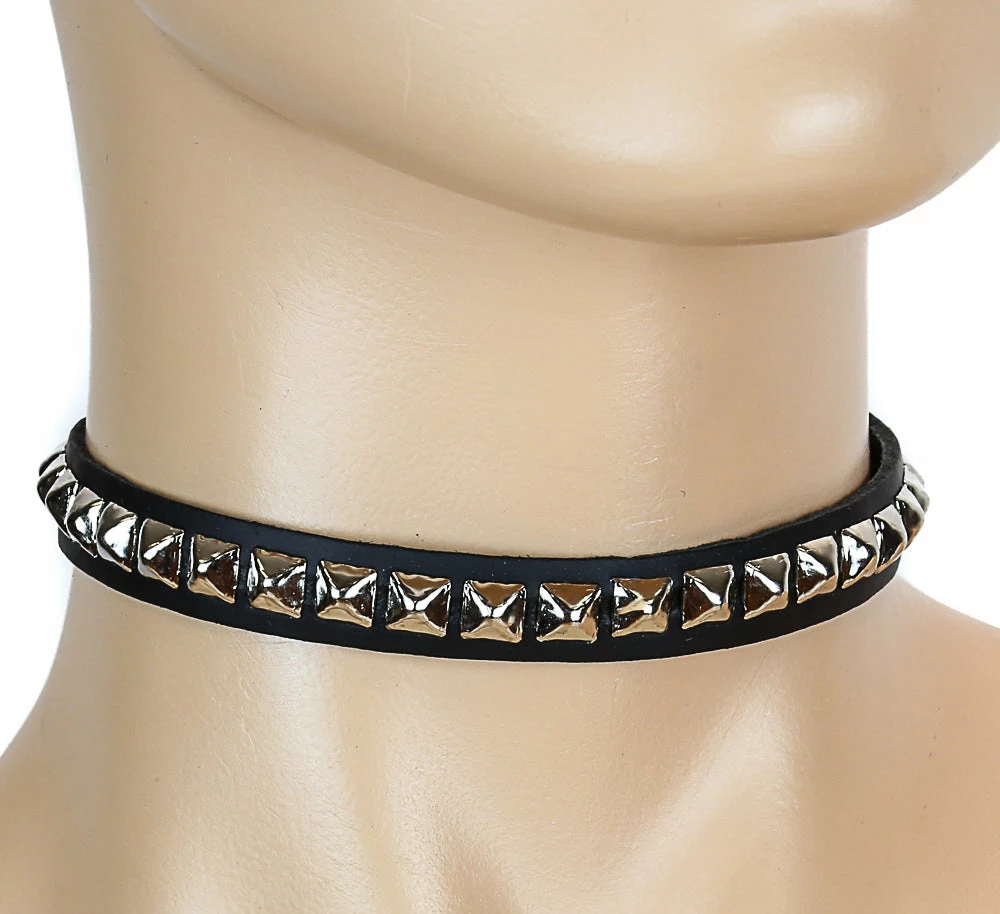 This 1/2″ black leather choker has a single row of silver 1/4″ pyramid studs.