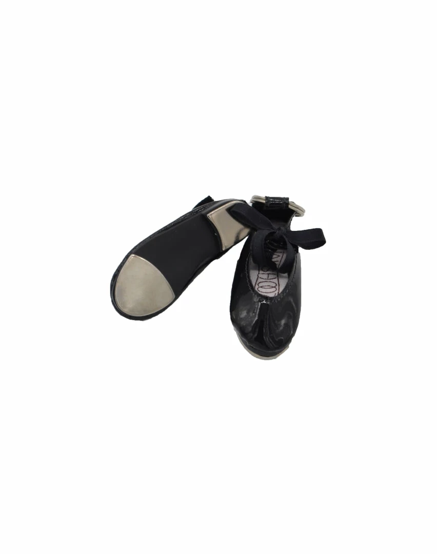 The Mini Patent Leather Tap Shoe keychain in black has an authentic design with a tie over the instep, composite sole and actual taps! The shoe measures 3″ and then the keychain attaches to the back tab which has a one inch diameter. Hook it onto your dance bag, backpack, or keys to show off your love for dance, makes a great gift for tappers of all ages! Please be advised that because the patent on the tap is reflective at the front, the image reflected the light. The actual keychain has a solid black upper.