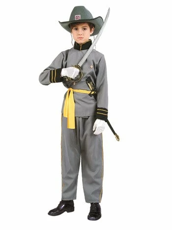 The Southern Officer Costume is perfect for your Civil War reenactments. The gray jacket has yellow trim with gold double breasted buttons. The jacket goes on easily with a velcro tab closure. The gray elastic waist pants have yellow piping down the side and also includes a waist sash. Hat, sword, gloves and boots are available separately.