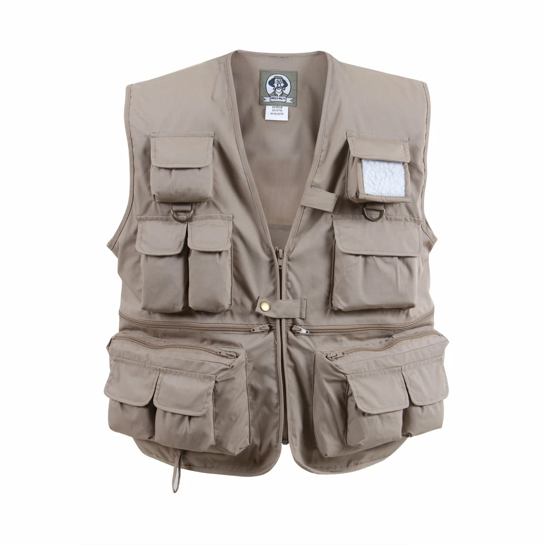 Uncle Milty’s Travel Vest is the ultimate travel vest with more pockets than you will know what to do with. The vest features 13 front pockets, 3 inside pockets, and a back cargo pocket with side zipper closure for maximum storage when traveling to your next destination. Made of comfortable yet durable 55% cotton / 45% polyester material, this photographer vest is ideal for any climate. The fishing vest has three D-rings with two attached to each top front pocket, and the other attached to the back of the neck collar. Along with a belt loop, the tactical vests have a front zipper and single snap closure. Great for travel, camping, fishing or EDC.