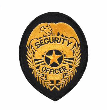 Standard security badge in embroidered goldenrod color on a black background. Measures 2.75 x 3.5 inches.