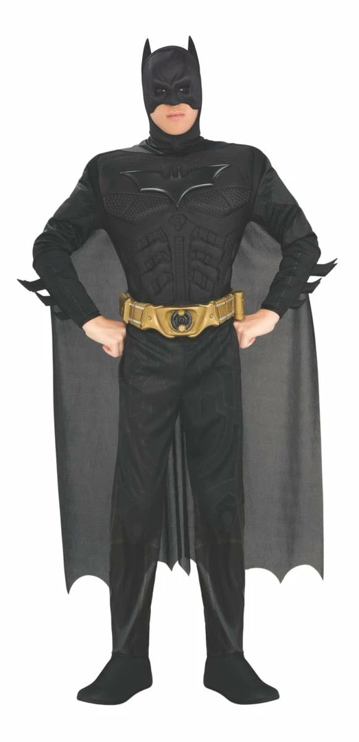 The Dark Knight Batman is our bestselling style! The black molded muscle jumpsuit has the boot tops and gauntlets attached with a belt, hood and cape.
