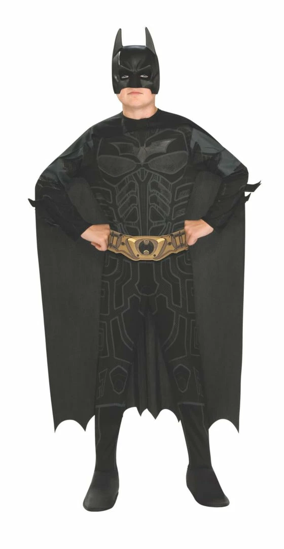 The Dark Knight Batman is our bestselling style! The black printed jumpsuit has the boot tops and gauntlets attached with a belt, hood and cape.