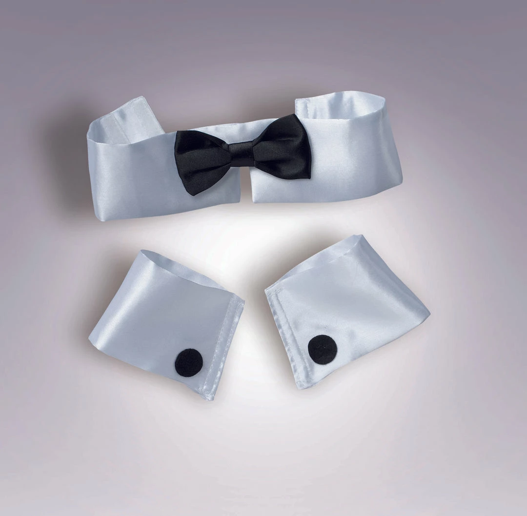 The collar and cuff set is great for those dressing up as Bunnies and Male exotic dancers. The accessories are made in a white satin with black buttons and black contrast stitching. The bowtie attaches to the separate collar which fits around the neck.