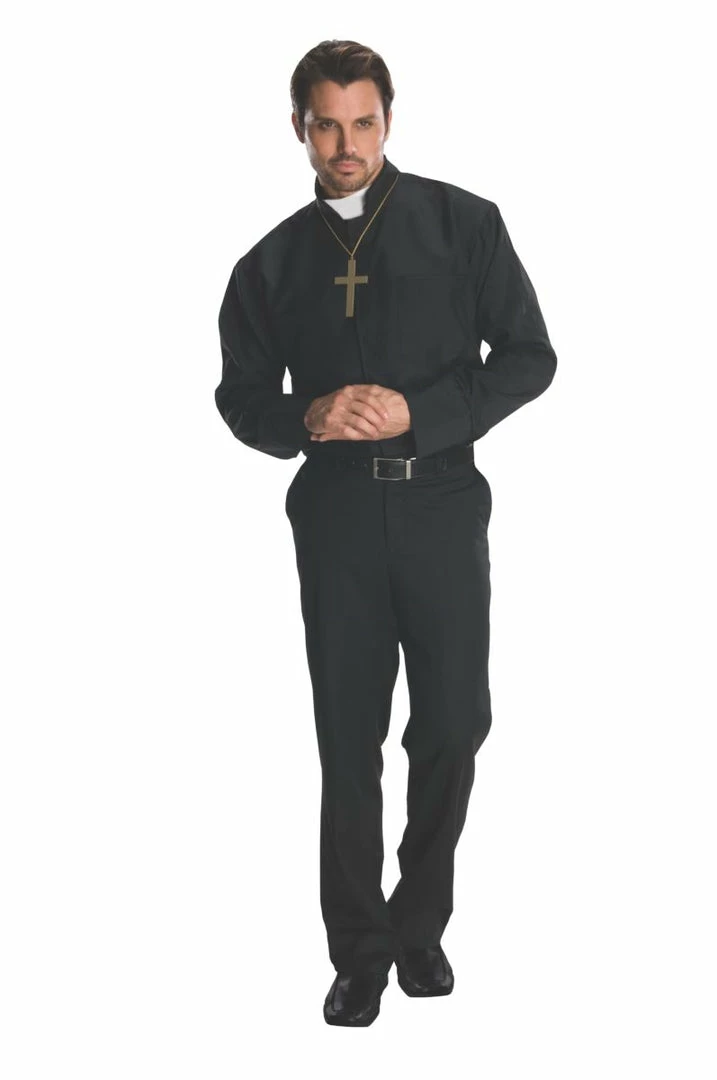 The priest shirt is an easy and comfortable alternative to the long cassock. The shirt looks like classic button down but actually has a front velcro closure in black with the white clerical collar attached. Pants are not included.