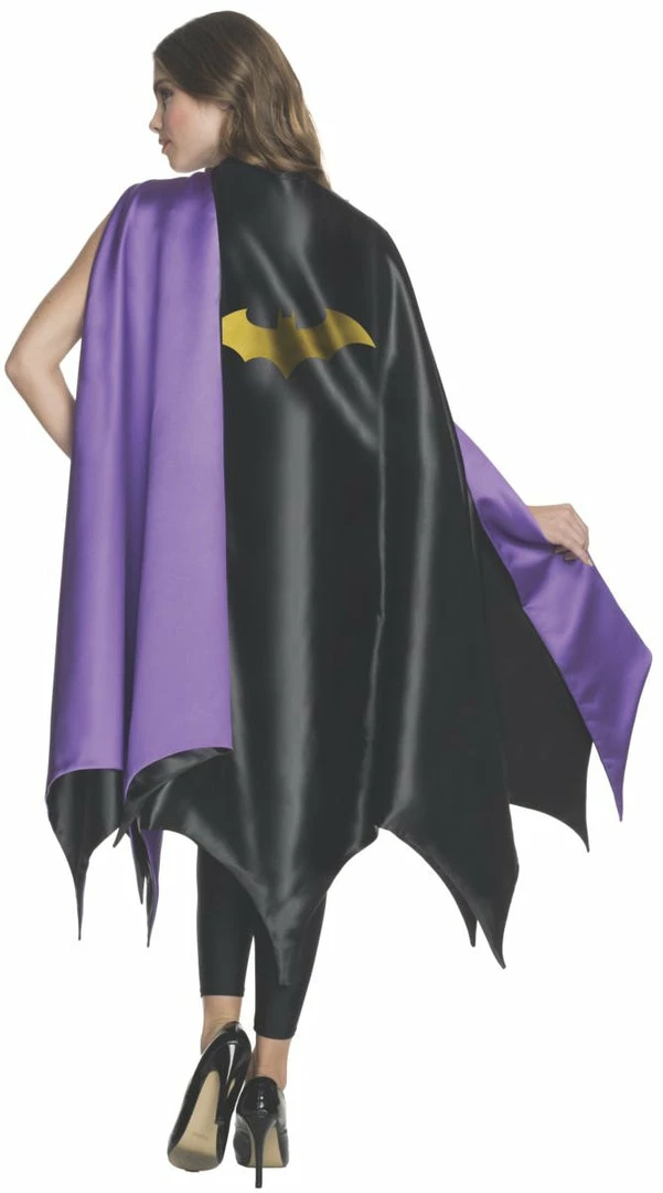 The Deluxe Batman Cape for adults is a great choice to add to your Batman costume or for your own unique DIY Batman or Batgirl. The heavyweight black satin cape has a purple lining with a scalloped bottom, a neck closure and a black Batman logo on the back. Great for adults and bigger kids who want their cape to provide more coverage.