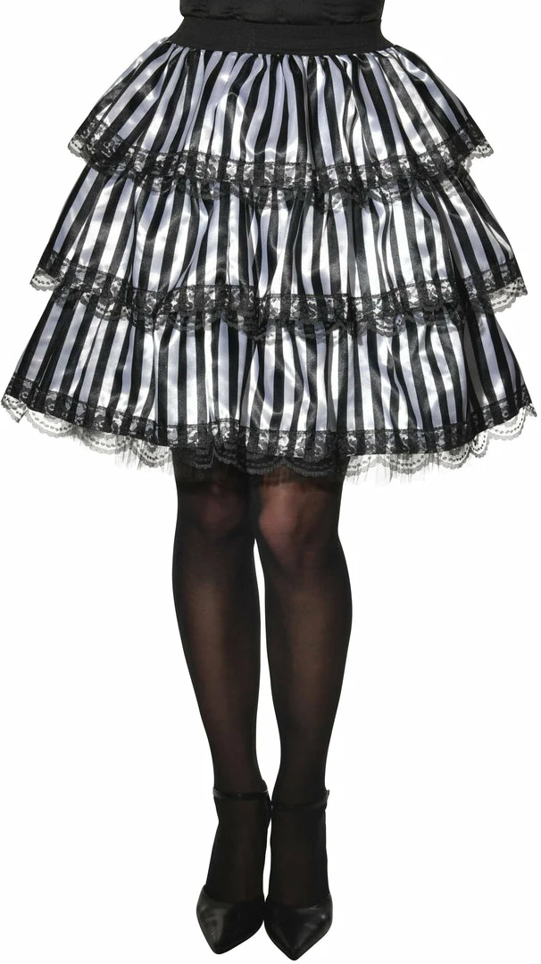 The black and white striped skirt is a great DIY costume starter. It is a great skirt for Can Can, Circus, Moulin Rouge, Saloon Girls, Harelequin, and Clowns. The skirt has layers of striped ruffles edged in black lace and an elastic waistband. Please be advised, this skirt runs small so it is one size but fits a S/M adult or teen size.