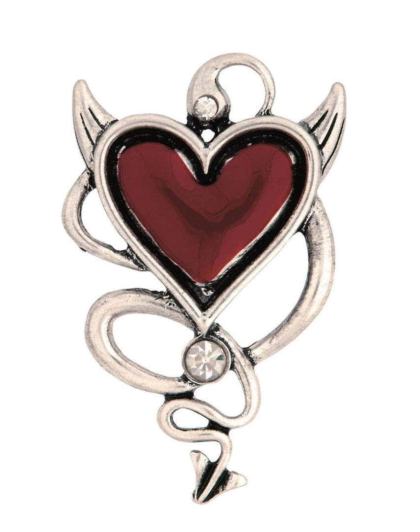 The elegant and intricate ring is a beautiful accent piece to any “dark” costume attire or for everyday wear. The ring features a deep ruby red heart with devil horns connected by delicate swirls and two silver rhinestones. Matches with Devil Heart Earrings.