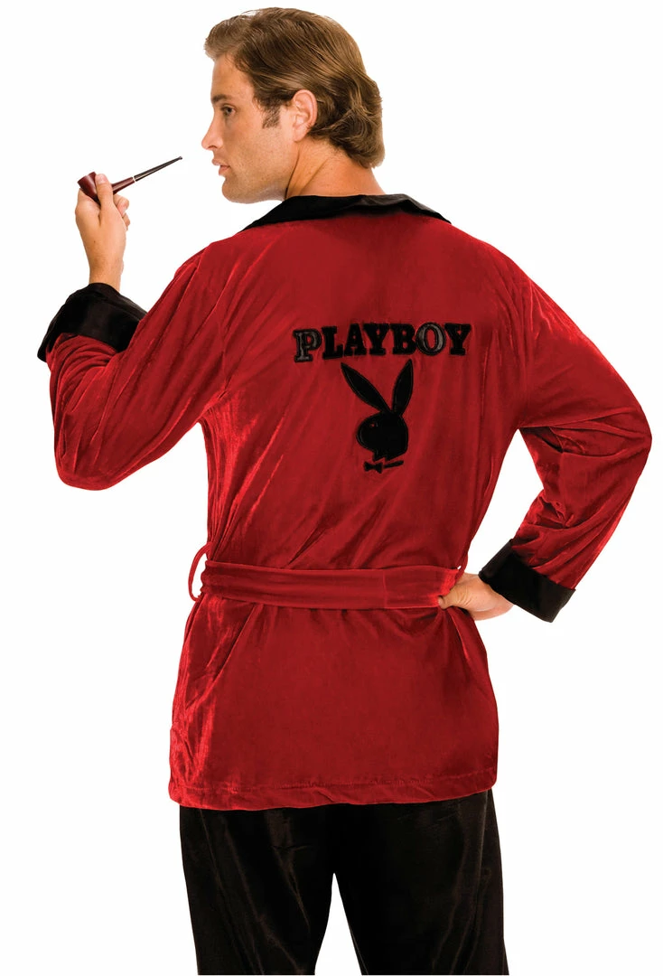 Size XL, Includes deluxe velvet burgundy Jacket with Playboy logo on back, waist tie, and pipe.