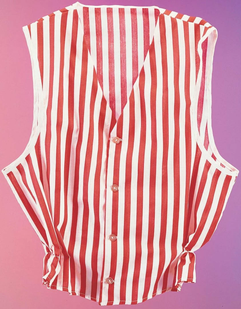 The red and white striped vest is the perfect look for a barber shop quartet or an old time bartender. The vest has functional buttons with elasticized sides and white binding.
