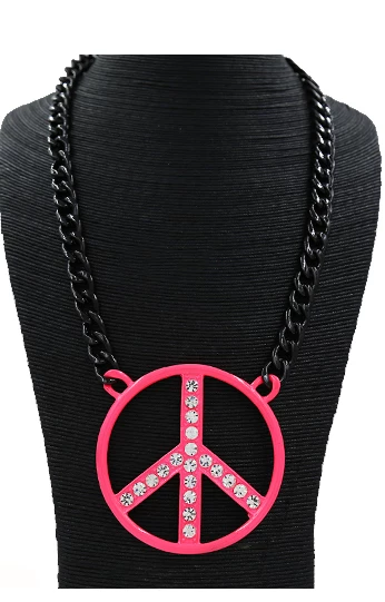 Hot Pink peace sign necklace with rhinestones is a great alternative to the classic peace sign for your 60’s costume. The hot pink peace sign is attached to a black enamel coated linked chain and measures 32″ long and the pendant is a 3″ in diameter.