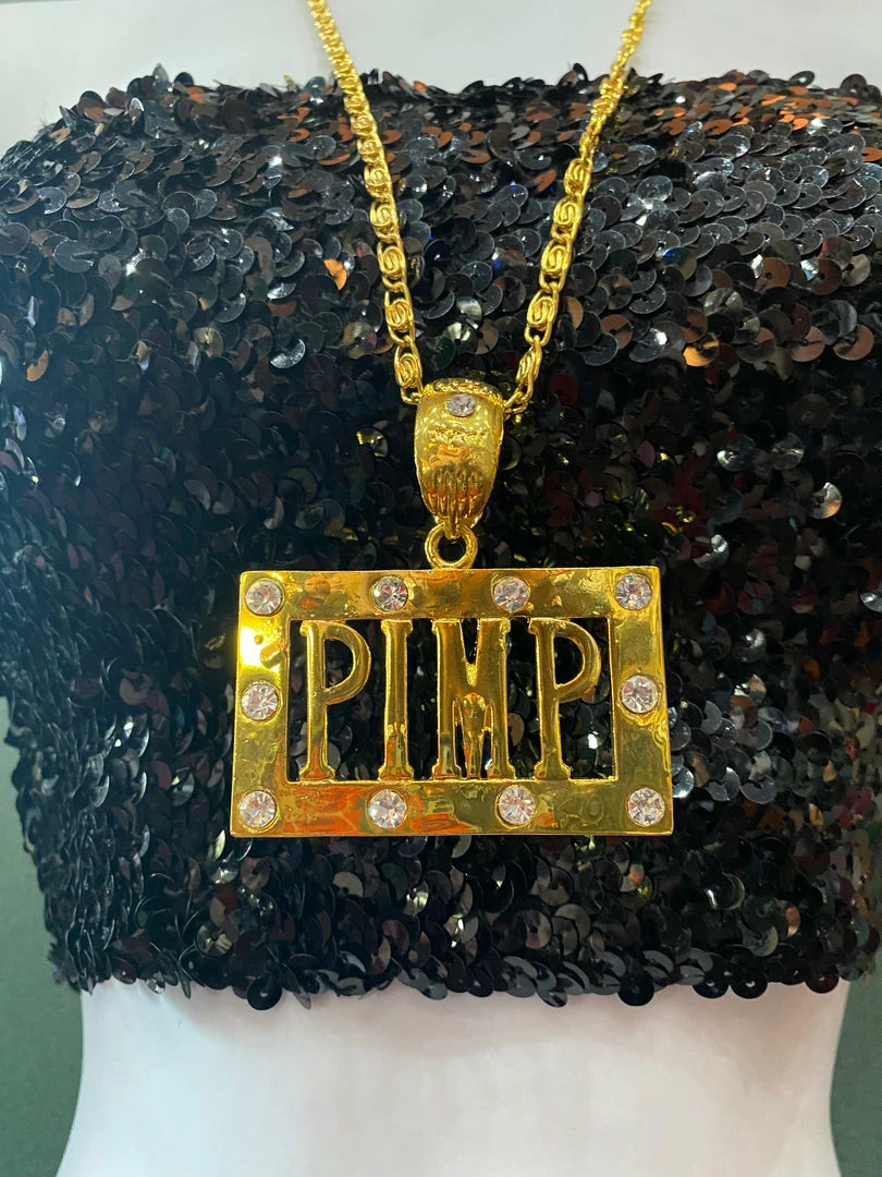 The Pimp pendant and link chain is the perfect finishing touch for any Disco or Pimp costume. The PIMP necklace measures 4”wide x 2” tall. Necklace is included. Made in Korea.
