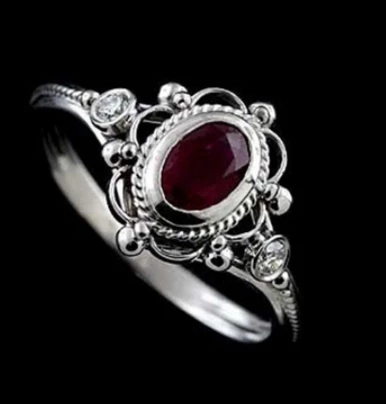 The elegant and surprisingly affordable scrolled stone ring is a beautiful accent piece to any “dark” costume attire or for everyday wear. The ring features a deep red or dark purple stone with inlaid silver scrolling.