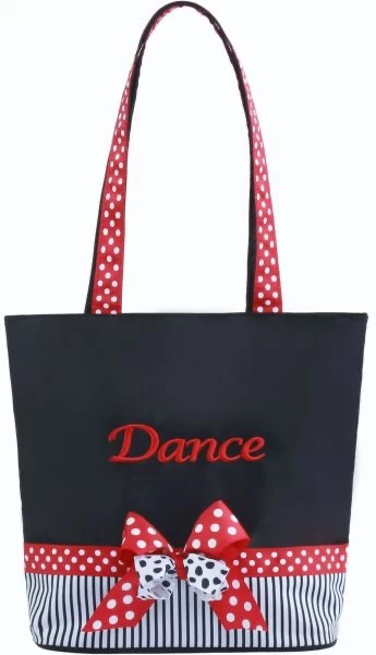“Dance” is beautifully embroidered with grosgrain ribbon and bow trim. Screen printed stripes. Microfiber material wipes clean with a damp cloth. Can be personalized.
